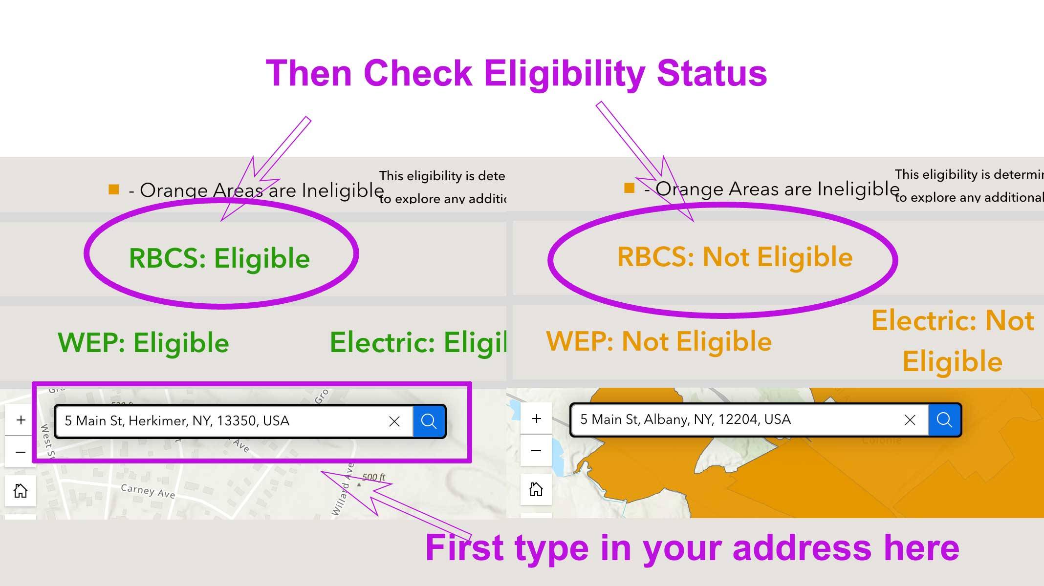 STEP 2: If the RBCS option shows “eligible”, please return here to complete the application. Click here to see an illustration of an eligible vs an ineligible location."*" indicates required fields